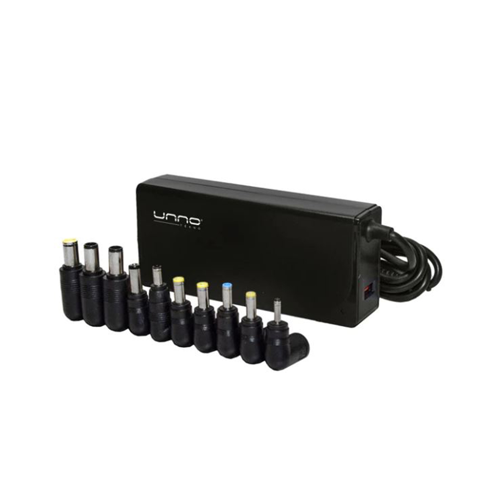 10 puntas universales de carga. Voltaje de entrada: 100 ~ 240V – 50/60Hz. Selección automática de 12V a 20V. 90W de potencia total de salida. Protección contra picos de voltaje.